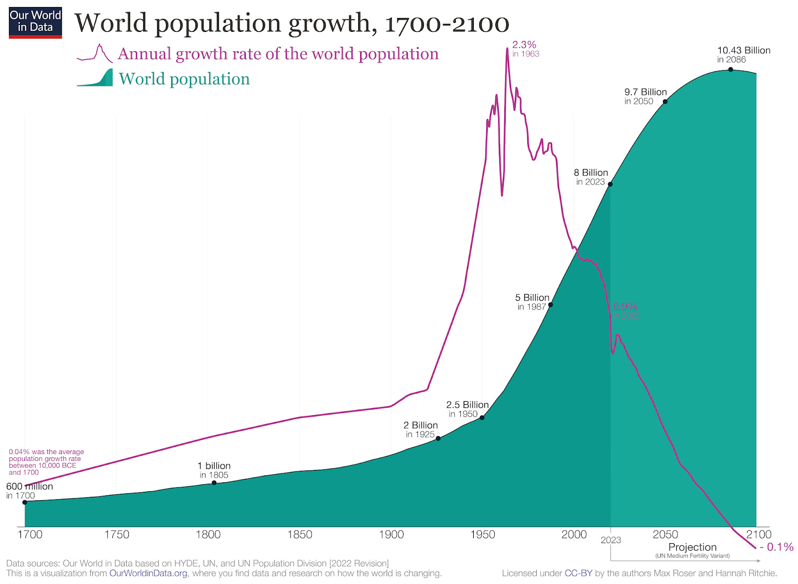 The magenta curve shows the growth rate, while the turquoise-filled area shows the world population. If the population for a given year is P and the growth rate is G%, then the population the next year will be P(1+G/100). When the growth rate is positive, that means the population will be growing exponentially. But if you look at the projections from 2023, you see that the population is still growing, though more and more slowly. Once that growth rate goes negative around 2100, the population starts to decrease.