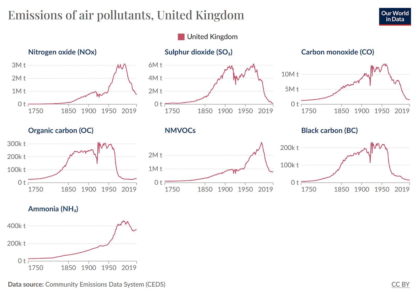This phenomenon is called the “environmental Kuznets curve”, and though Hannah says it isn’t true for all environmental metrics (or other metrics), it does apply for air pollution. She makes the point that while it took a long time for some of the early countries to go through this curve (like the UK and the US), others are going much quicker because of technological advances: